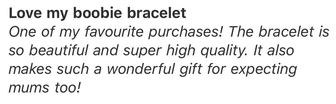 I am so pleased with my boobie bracelet. I haven’t taken it off since I got it, as it helps me keep track of breastfeeding sides. The quality is wonderful, and the engraving is such a nice touch.