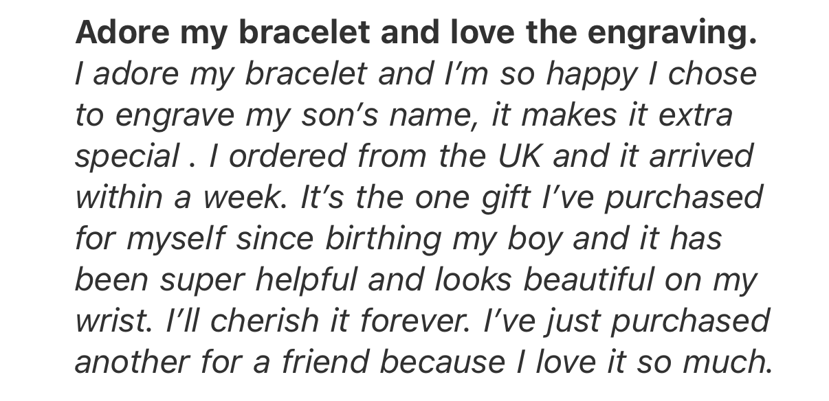 I am so pleased with my boobie bracelet. I haven’t taken it off since I got it, as it helps me keep track of breastfeeding sides. The quality is wonderful, and the engraving is such a nice touch.