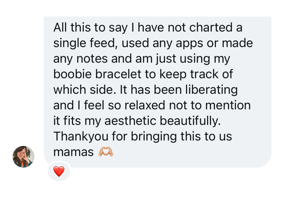 I am so pleased with my boobie bracelet. I haven’t taken it off since I got it, as it helps me keep track of breastfeeding sides. The quality is wonderful, and the engraving is such a nice touch.